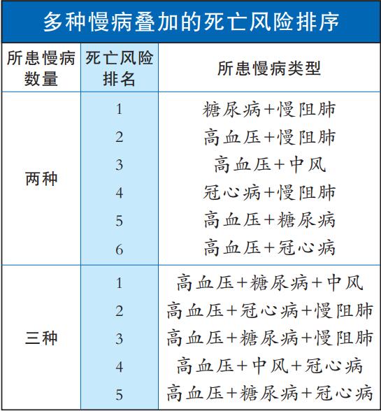 “共病”更是加劇了慢病威脅。6月5日,鄭州大學(xué)公共衛(wèi)生學(xué)院發(fā)表的一項(xiàng)對(duì)5萬(wàn)名65歲及以上中國(guó)人的研究發(fā)現(xiàn),多發(fā)慢病與全因死亡率呈正相關(guān)。與沒(méi)有慢病的參試者相比,具有1、2和3種慢病者全因死亡率分別增加45%、72%和115%(死亡風(fēng)險(xiǎn)排序見(jiàn)圖表)。此外,吸煙飲酒、體重過(guò)輕、運(yùn)動(dòng)不足的人死亡風(fēng)險(xiǎn)較高。