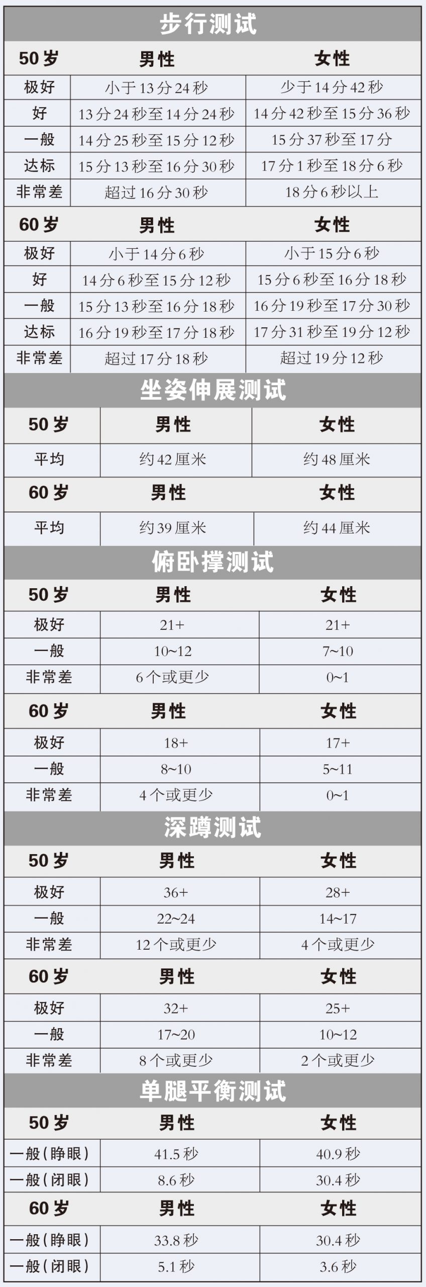 你是怎么發(fā)現(xiàn)自己變老了?是新添的白發(fā)還是皺紋?其實(shí),衰老從來不是瞬間降臨的,美國梅奧診所健康生活項(xiàng)目醫(yī)學(xué)顧問唐納德·韓斯盧德博士表示,了解身體衰老現(xiàn)狀,有助于制訂更有的放矢的個(gè)性化健身方案。美國退休人員協(xié)會(huì)官網(wǎng)最新刊文,推薦“可判斷衰老現(xiàn)狀的5項(xiàng)自我測試”,具體標(biāo)準(zhǔn)如右表,大家可以將其作為參考,進(jìn)行一個(gè)簡單評(píng)估。